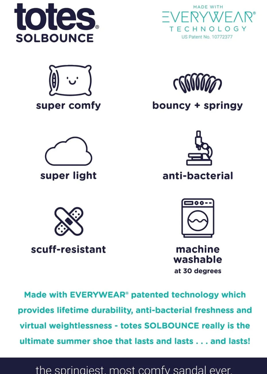 New to totes, our totes® SOLBOUNCE range have Life time durability and are lighter than traditional sandals. Our Everywear™ technology provides a Compression Proof insole that means it will keep its shape even after thousand’s of hours of wear time. They can be folded, squashed and bundled and will always return to their original shape, with anti bacterial compound delivered by the rubber itself, for freshness that lasts. These sandals will put a spring in your step!