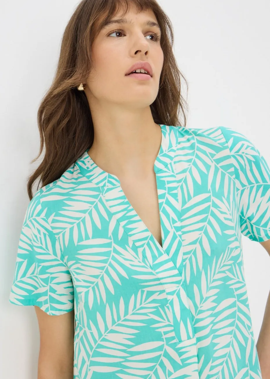 This Turquoise Leaf Popover Tunic is a versatile and stylish piece that can be dressed up or down. Crafted from a soft and smooth fabric, it features a beautiful leaf print in turquoise and white. The relaxed silhouette is flattering on all body types, while the popover style makes it easy to wear. Perfect for layering over swimwear.