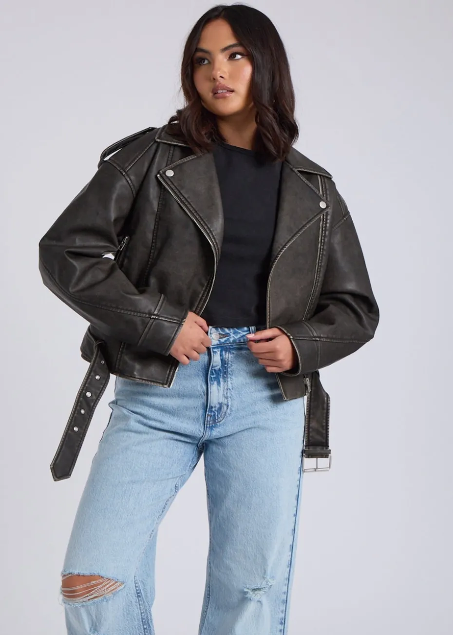 Model is 5’6 wears a size 8. Buckle Detail. Faux Leather. Zip Up. A distressed biker jacket combines rugged style with a worn-in, vintage appeal. This jacket typically features a classic cut with a slightly asymmetrical zipper closure, wide lapels, and epaulets on the shoulders. Made from high-quality leather or faux leather, the distressed biker jacket exudes a sense of rebelliousness and adventure, making it a timeless staple in any edgy, fashion-forward wardrobe.