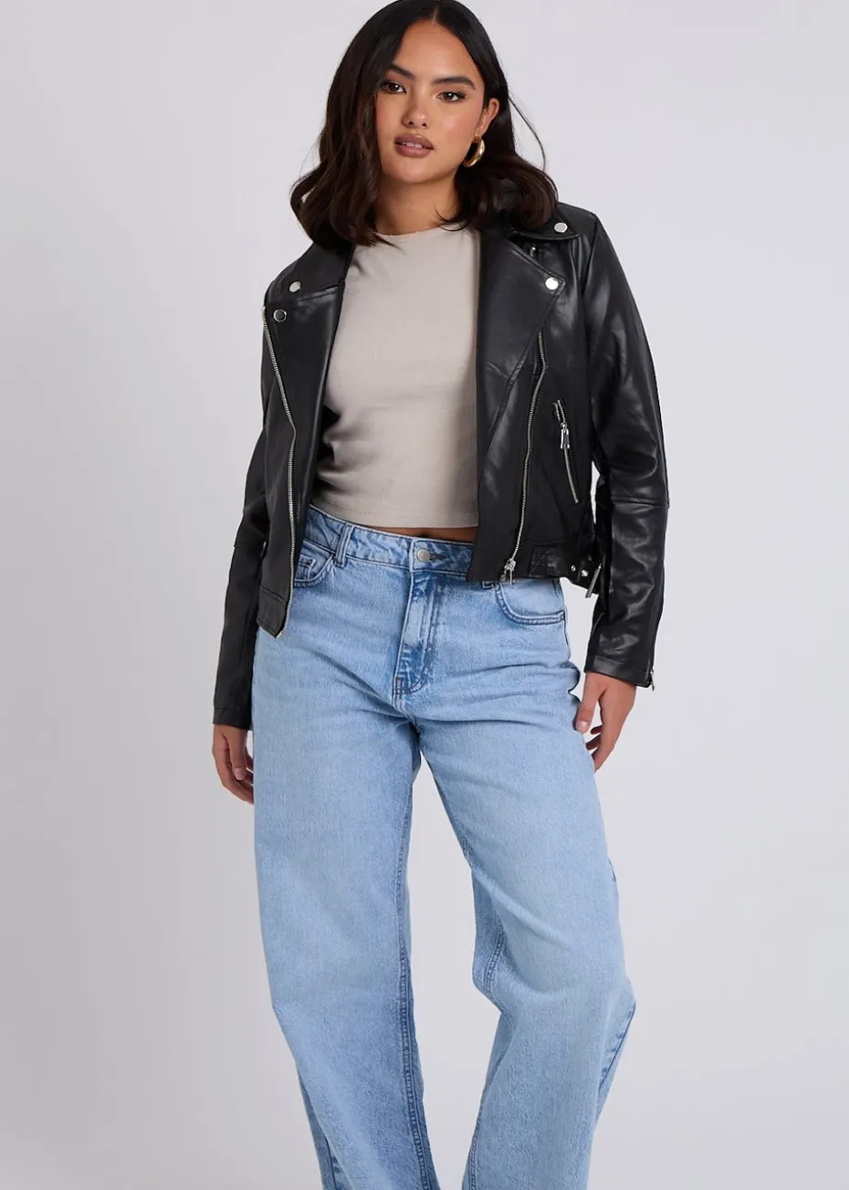 Model is 5’7 and wears a size 8. Regular fit. Long sleeves. Zip pockets. Zip fastening. Leather-look.