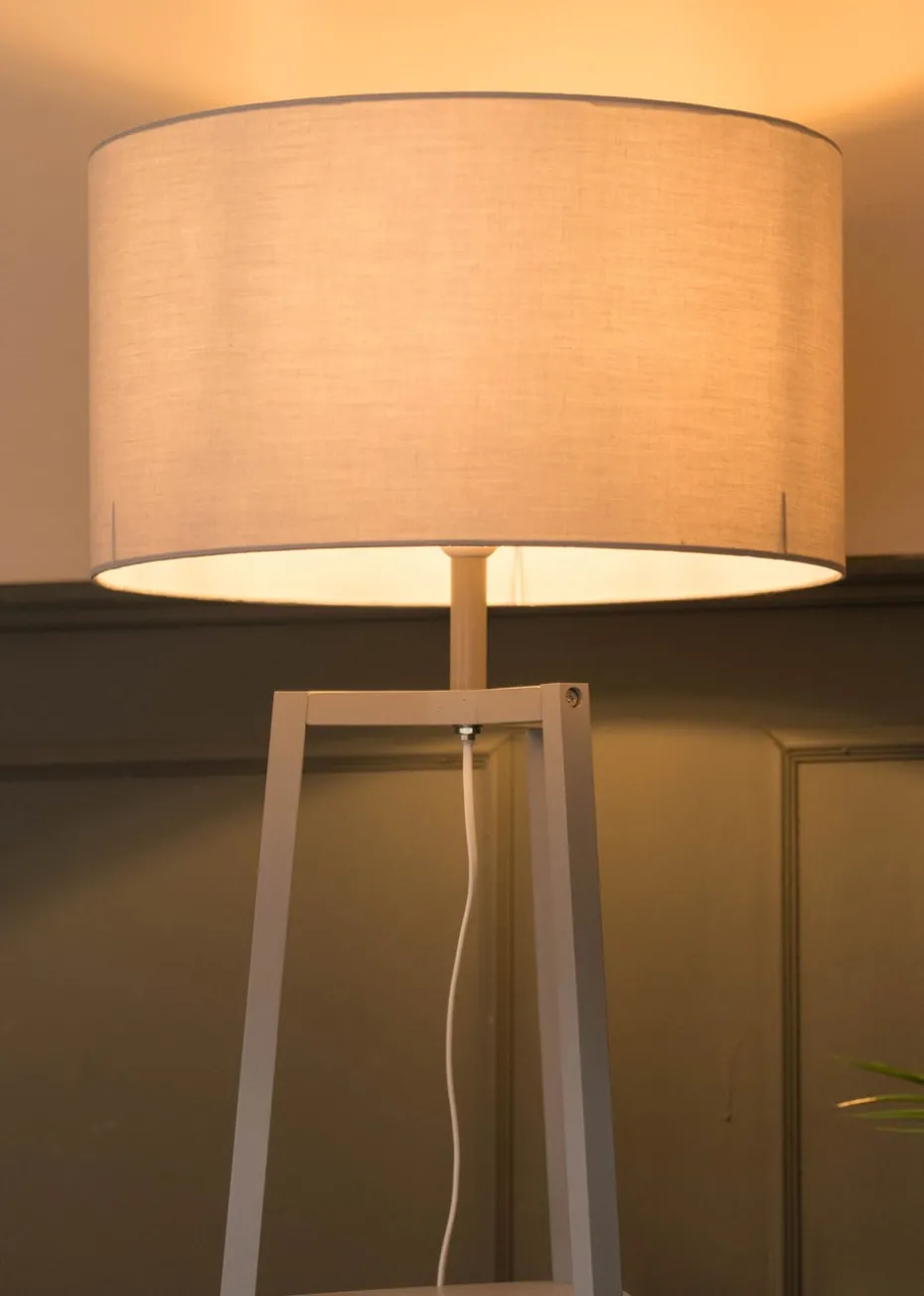 Update your living space with the latest trends in lighting. Mixing quality materials and stylish designs, our range of products are perfect for adding a modern style to your home. This floor lamp comes in a wooden finish and features a 3 tier shelf design base, ideal for displaying ornaments, pictures and other decorative items. Complete with an extra large fabric lampshade. Requires 1 x LED 6W ES E27 bulb (not included).