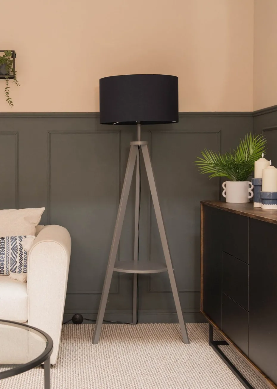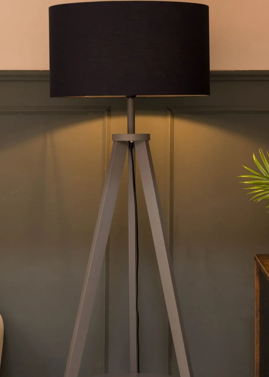 This tripod floor lamp comes in a grey wood finish. It features a middle shelf for convenient storage and an in-line on/off switch for easy use. Ideal for living rooms, dining rooms and other living areas. Complete with a fabric shade. Requires 1 x LED 6W ES E27 bulb (not included).