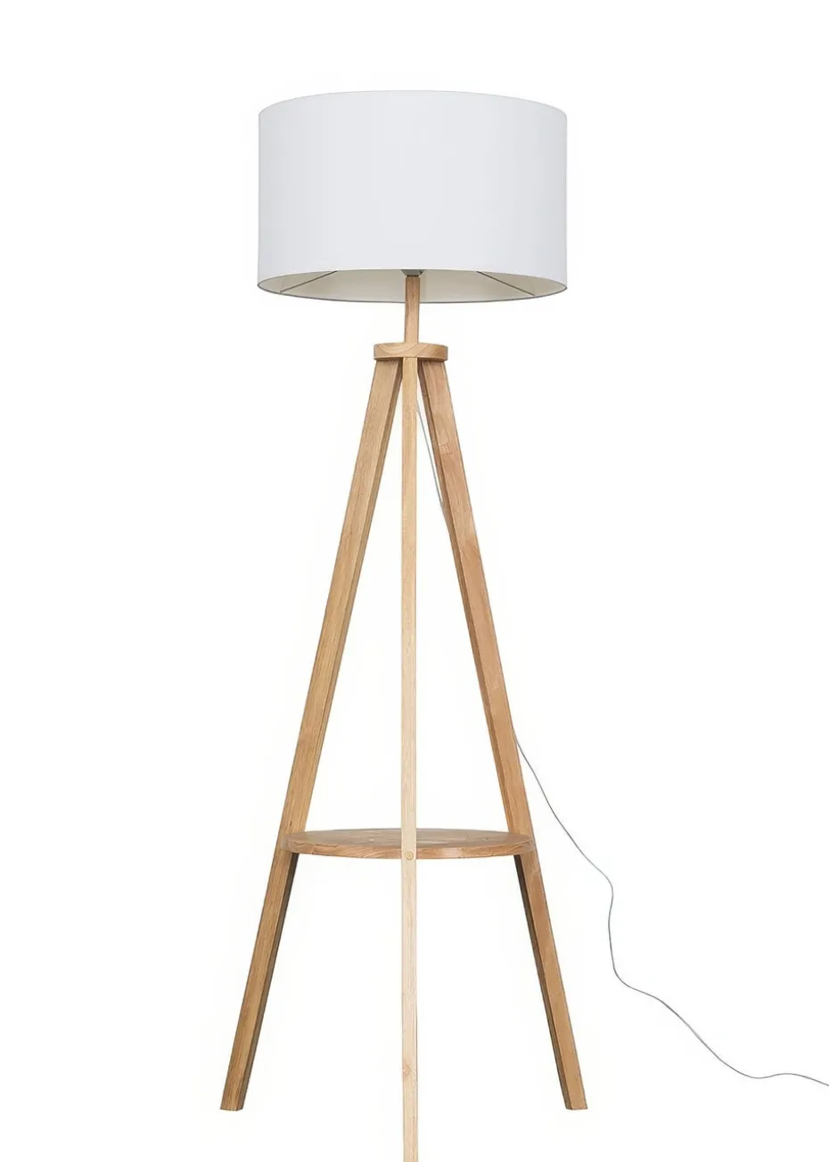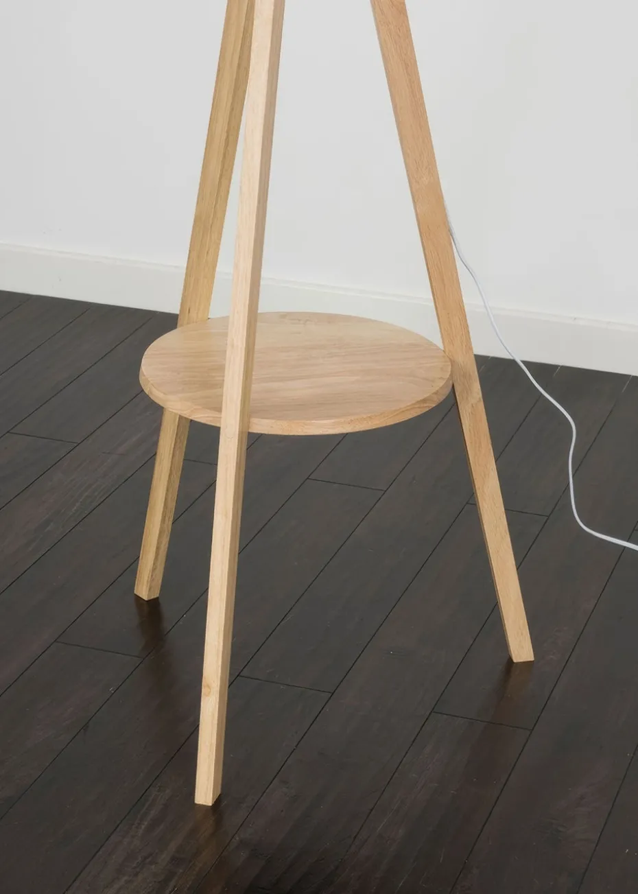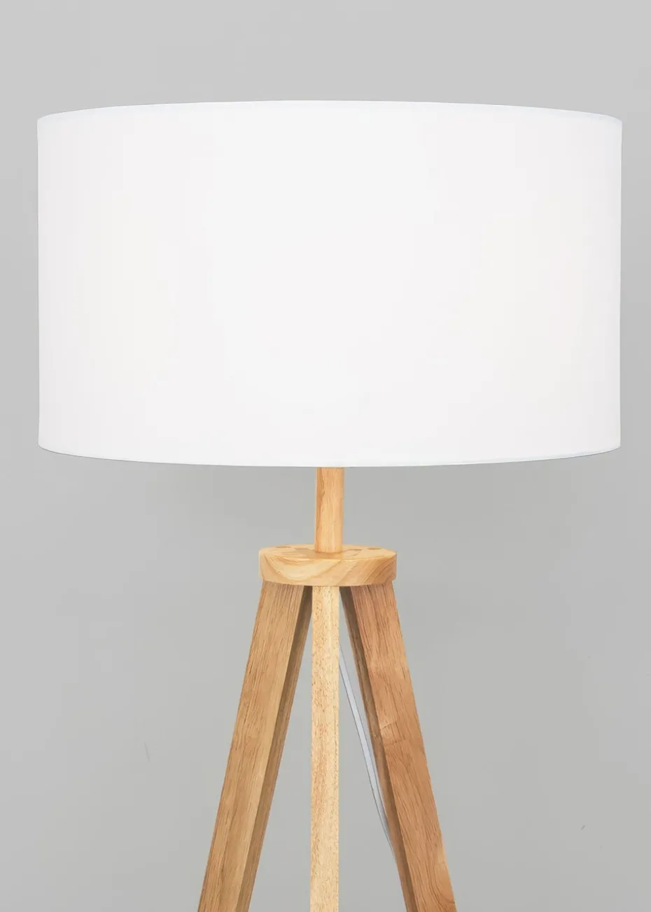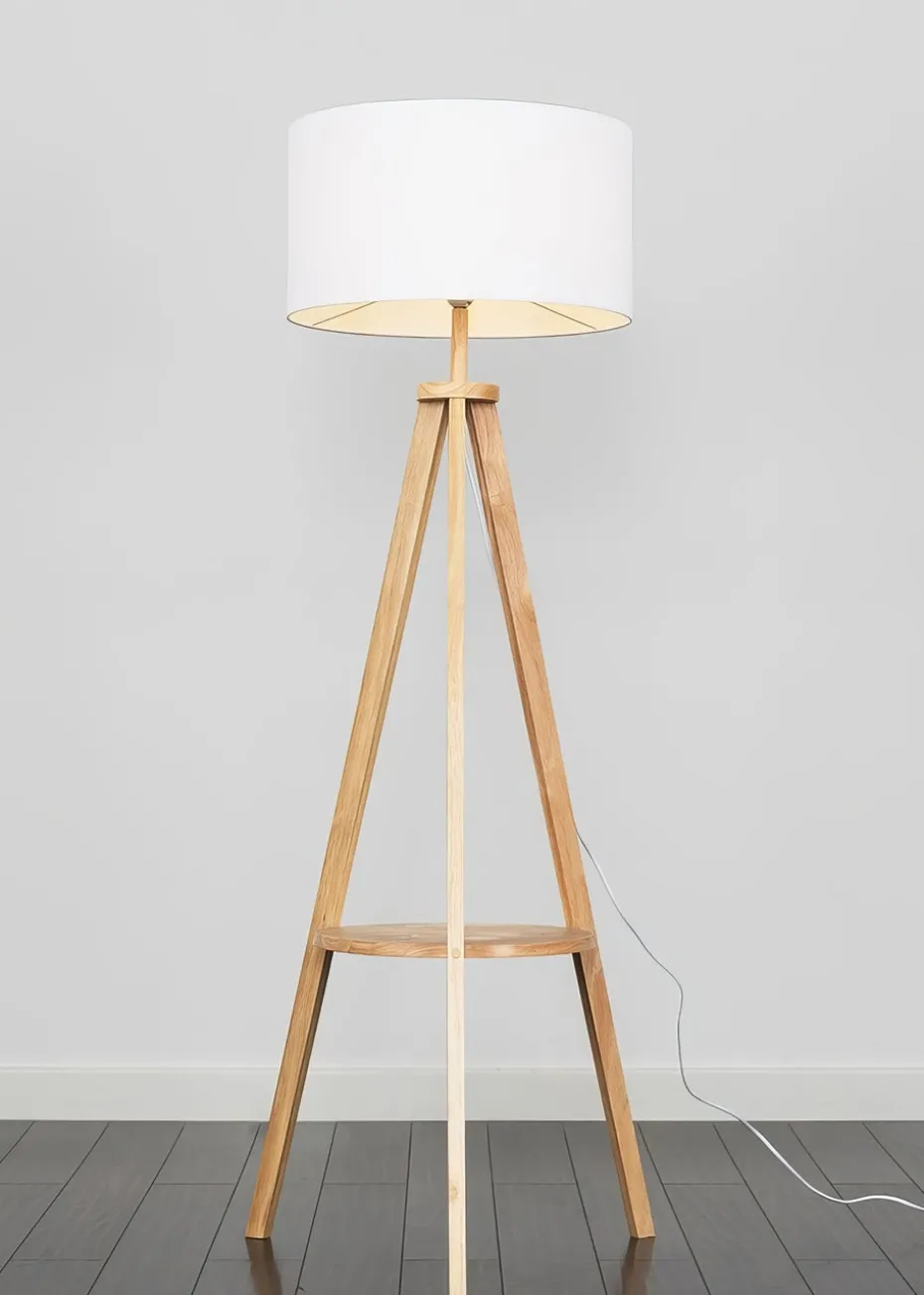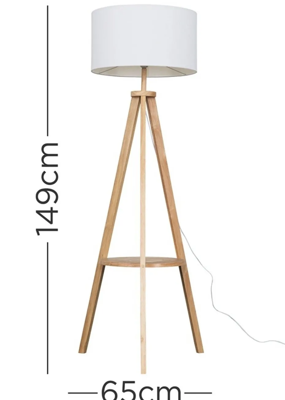 This tripod floor lamp comes in a light wood finish. It features a middle shelf for convenient storage and an in-line on/off switch for easy use. Ideal for living rooms, dining rooms and other living areas. Complete with a fabric shade. Requires 1 x LED 6W ES E27 bulb (not included).