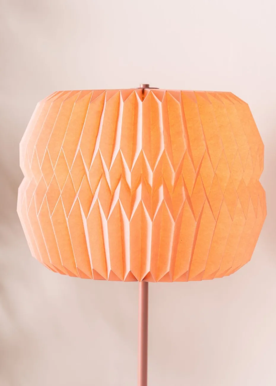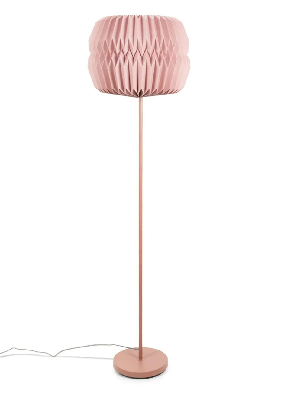 Add a contemporary element to your decor with this on-trend floor lamp. Featuring a metal stem in a rusty pink finish, complete with a matching paper fold, pleated lampshade. The in-line on/off foot switch provides convenient control, making it easy to illuminate your space. Whether your style is modern or sleek and minimalist, this lamp will fit perfectly into any room in your home. Requires 1 x LED 6W ES E27 bulb (not included).