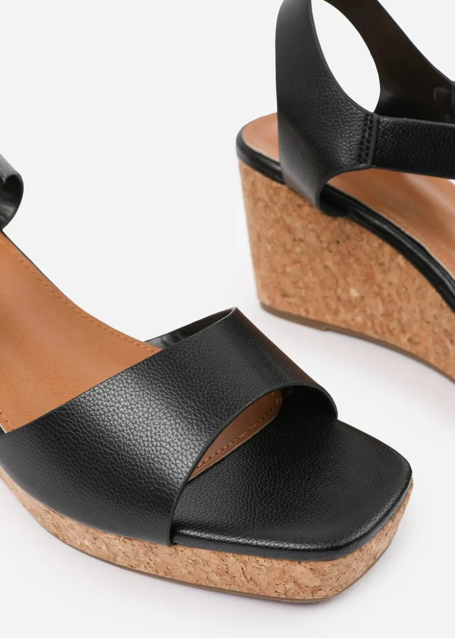 Where's That From Black PU Giselle Wedge Sandals With Buckle-Ankle-Strap