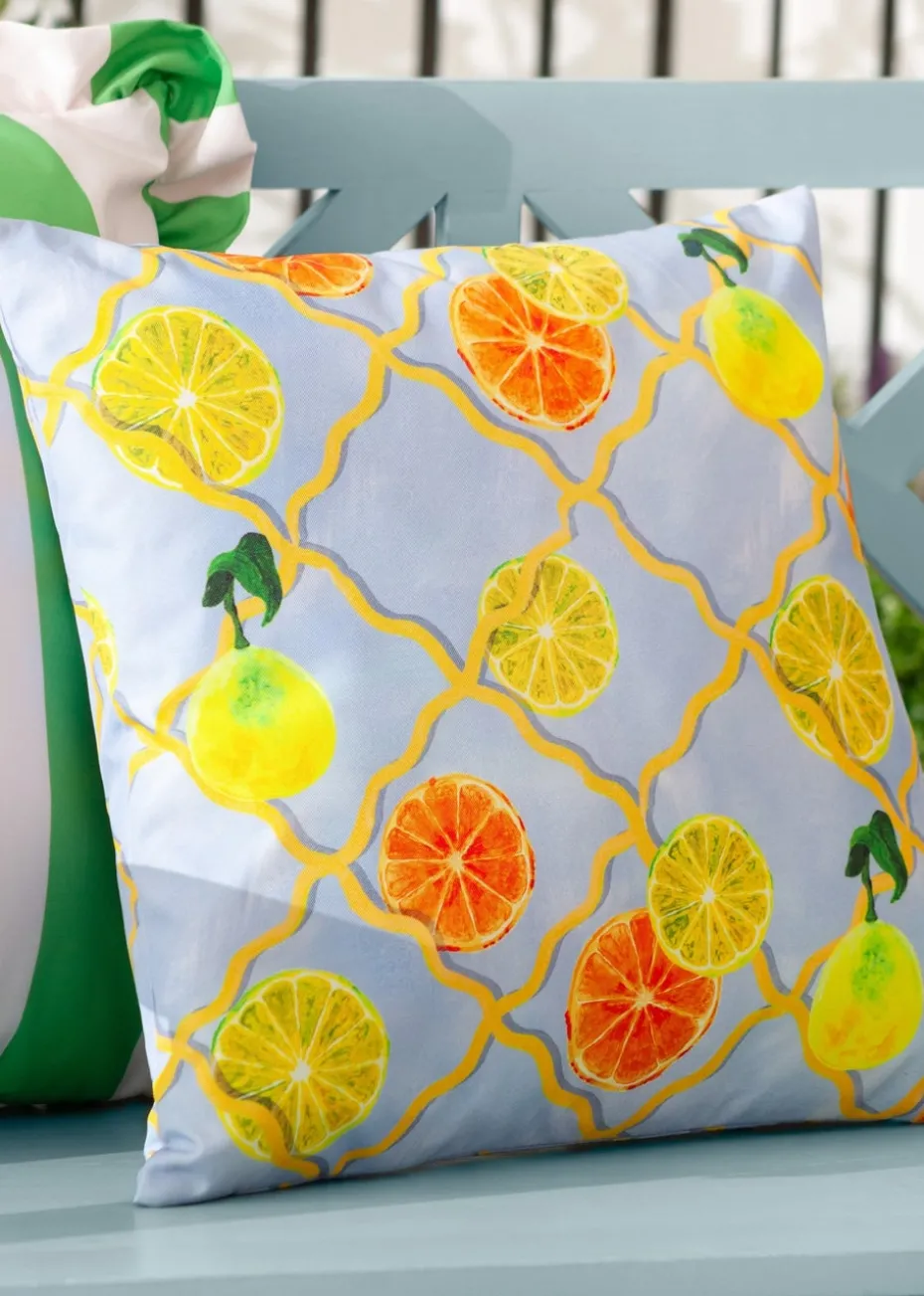 Add a touch of style and zest to any outdoor area with the Citrus Trellis Outdoor Cushion. This durable, reversible cushion embodies a fusion of modern and tropical styles, offering a captivating geometric trellis intertwined with vibrant citrus fruit motifs. Designed for those who value artful prints and nature’s beauty, this cushion transforms spaces with its unique design. Engineered to endure the elements, its hardwearing and water-resistant qualities ensure use throughout the year, while its easy-to-clean fabric makes maintenance a breeze. Experience the perfect blend of style and functionality with this exceptional outdoor accessory.