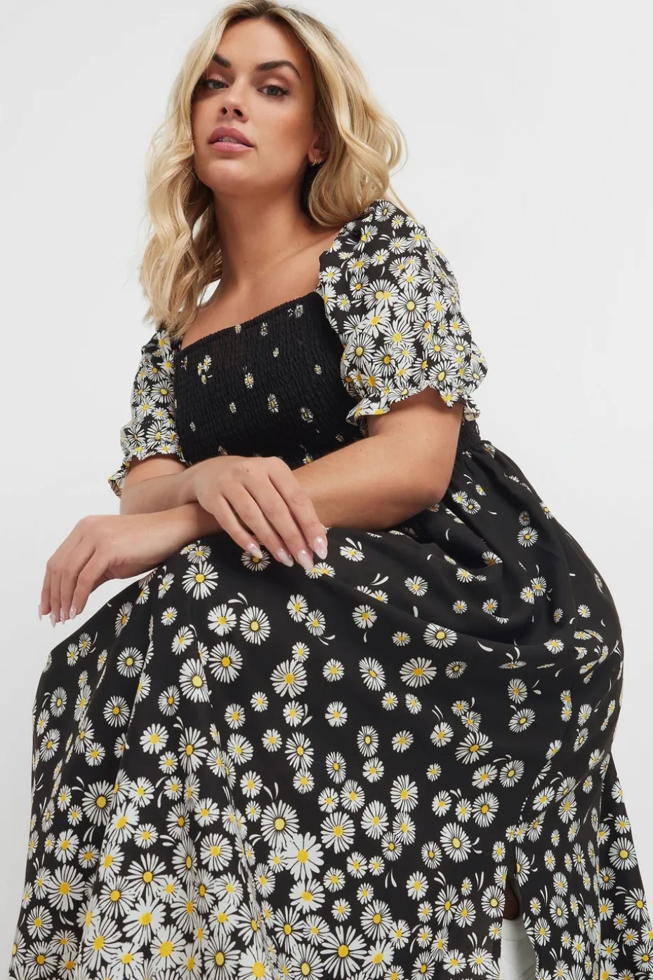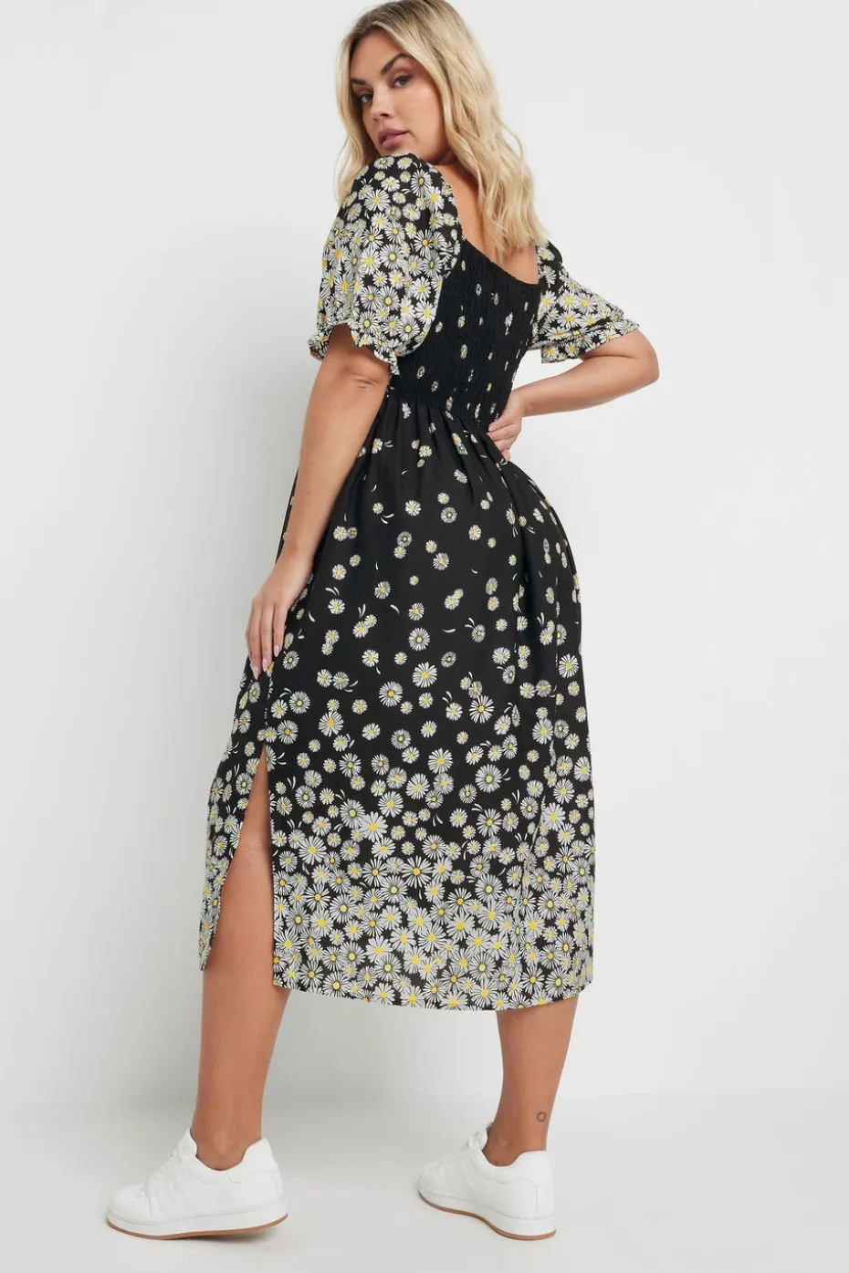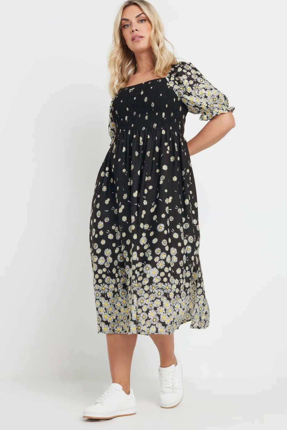 Don’t miss out on this new-in summer staple Made from a breathable woven fabric, this dress features a daisy print, a shirred front, a square neckline, short sleeves, and a midi length. Simply style with sandals or trainers for a weekend winning look Model is 5′ 9.5″ / 176.53 cm and size UK 16/EU 44.