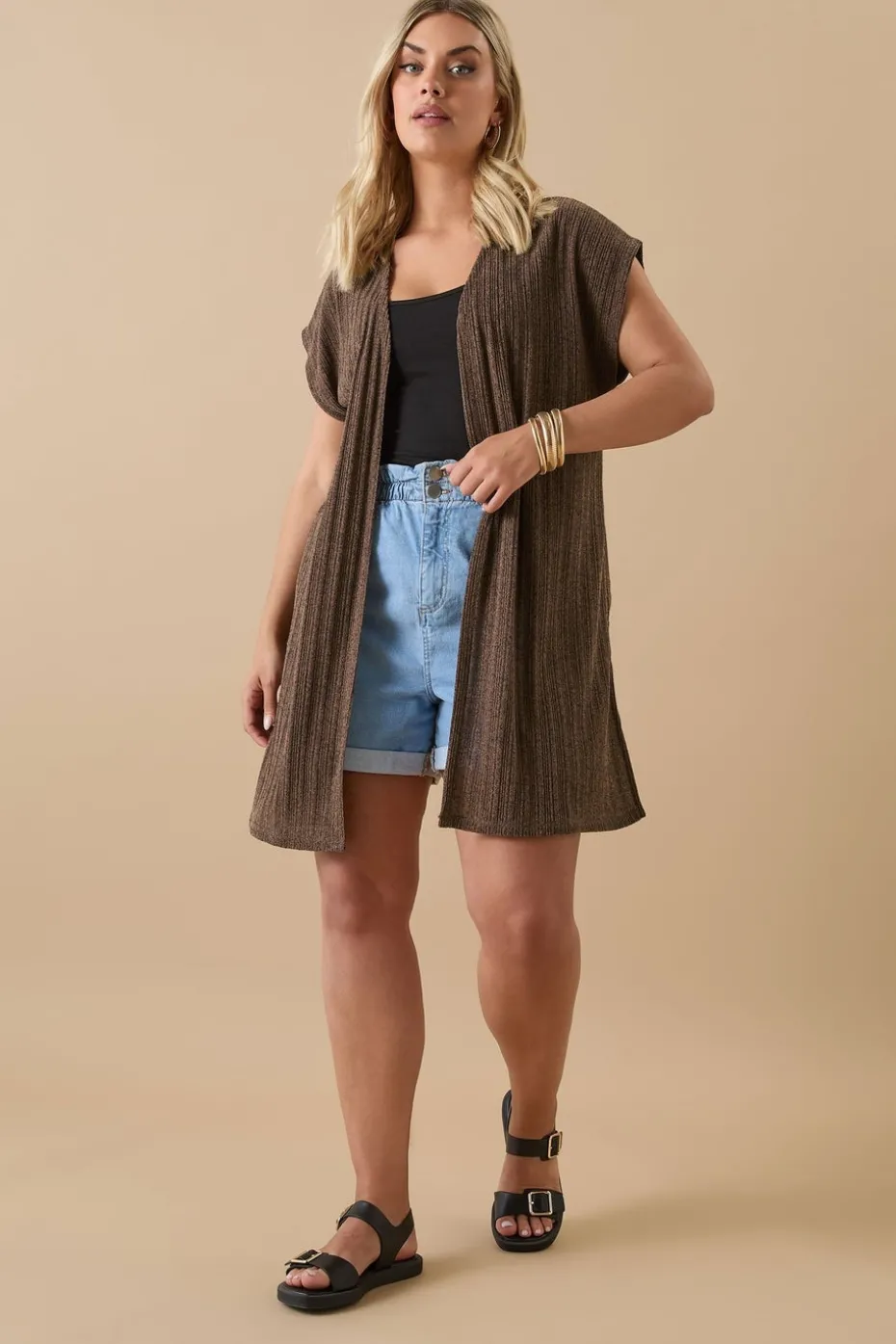 The perfect lighter layer for your wardrobe this season Made from a comfortable jersey fabric, this new-in cardigan features a ribbed texture, an open front design, and short grown on sleeves. Layer over a vest and shorts for an everyday summer look you can rely on Model is 5′ 9.5″ / 176.53 cm and size UK 16/EU 44.