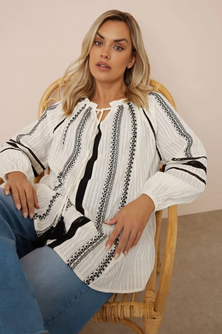 Embrace the feel of spring-summer with this embroidered contrast tie neck blouse. Made from a soft cotton fabric, it features long sleeves, tassel details and a tie neck feature. Pair with jeans and sandals for an everyday look you will love. Model is 5′ 9.5″ / 176.53 cm and size UK 16/EU 44.