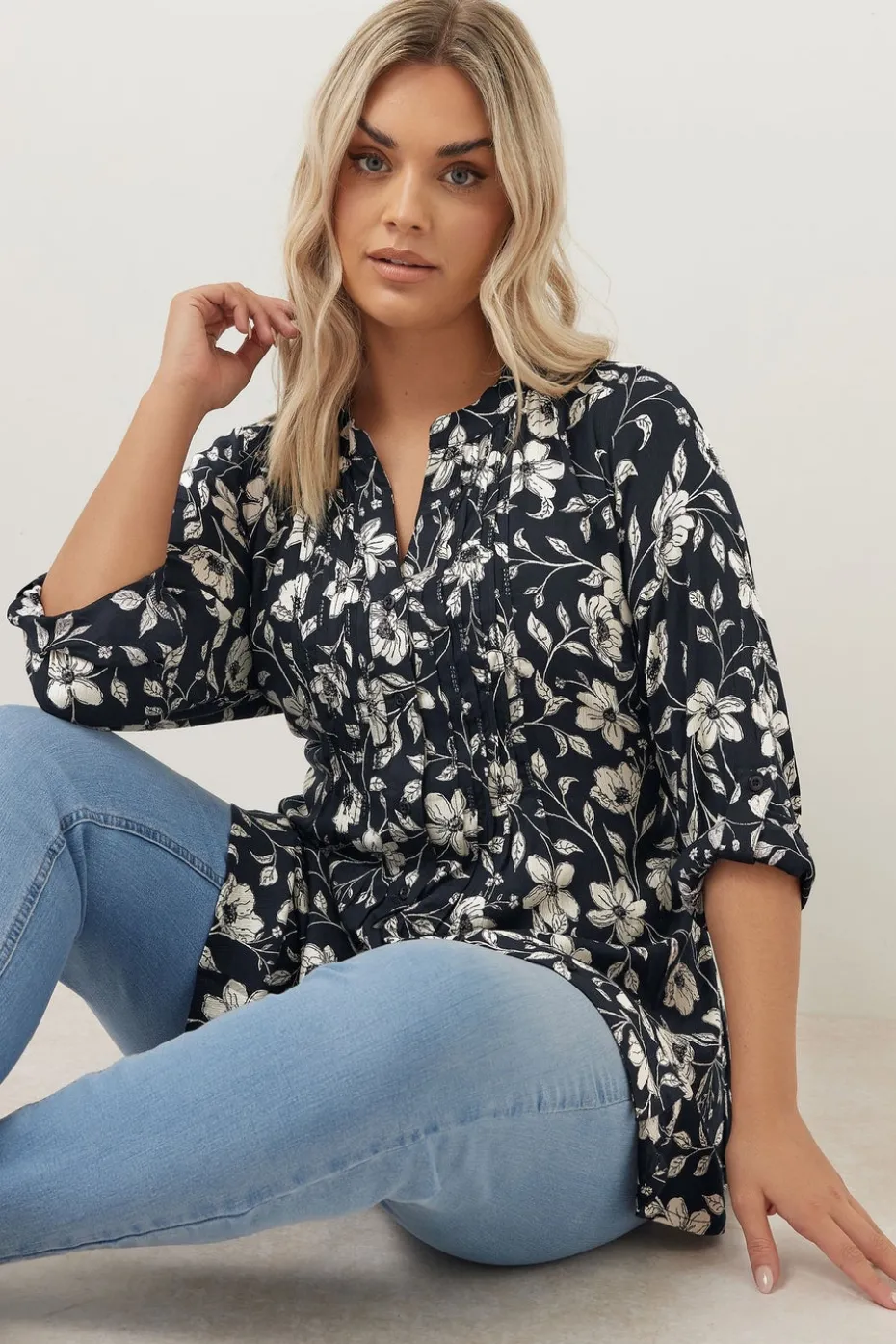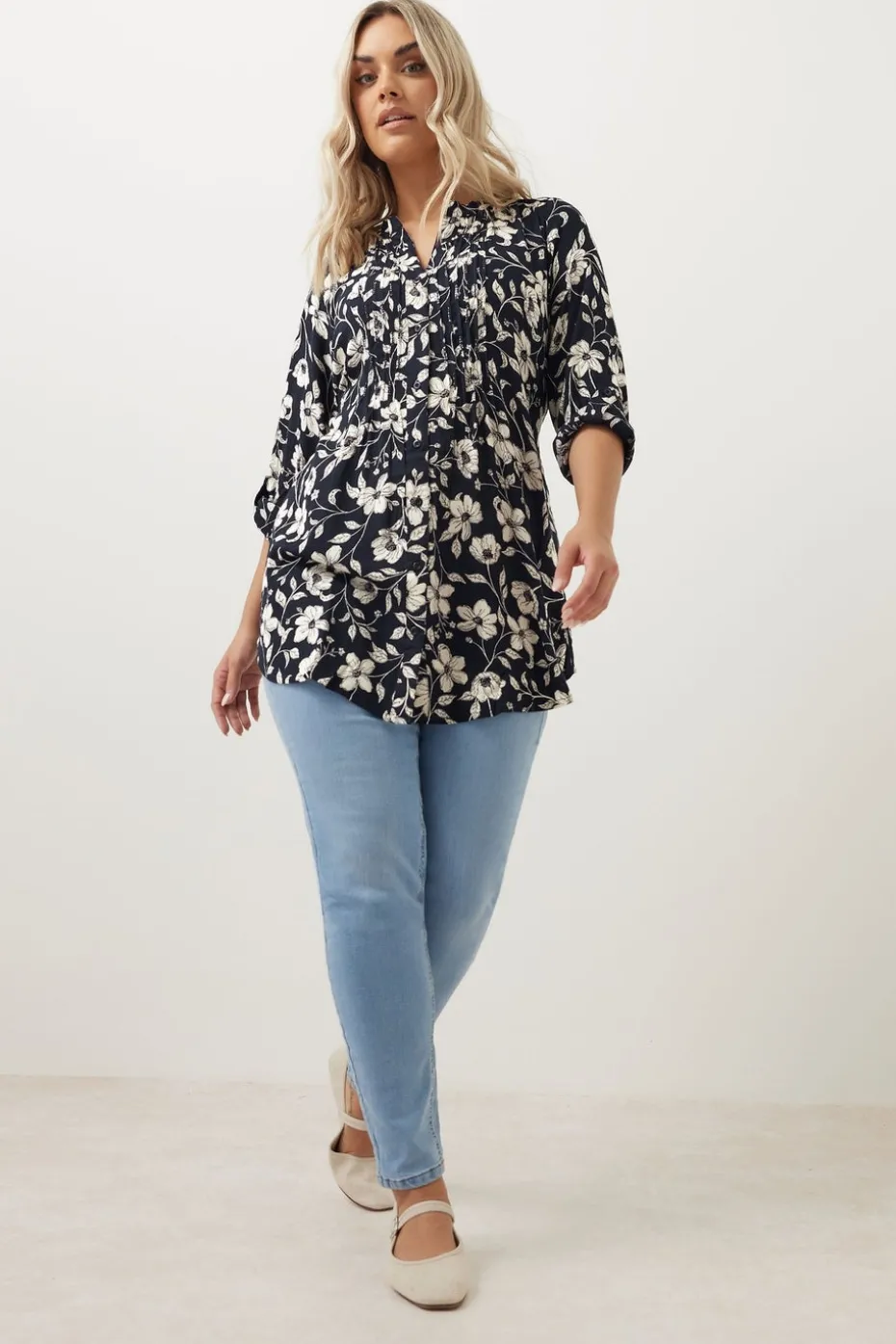 Upgrade your new season collection with this must-have blouse. Made from a comfortable woven fabric, it features a floral print with pintuck detail and 3/4 length roll tab sleeves. Team with jeans and loafers for a look that can take you from desk-to-dinner in style. Model is 5′ 9.5″ / 176.53 cm and size UK 16/EU 44.