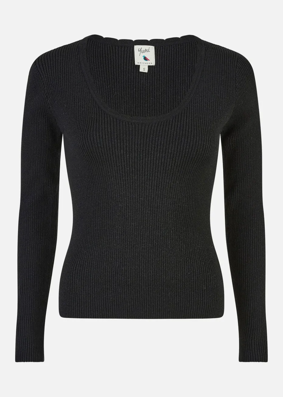 This cute fitted top from Yumi is perfect for the changing seasons – In a shimmering Metallic lightweight knit, the ribbed design adds some comfort to this style. The scallop round neckline and long sleeve design is perfect for pairing with your jeans and trainers for a casual look.