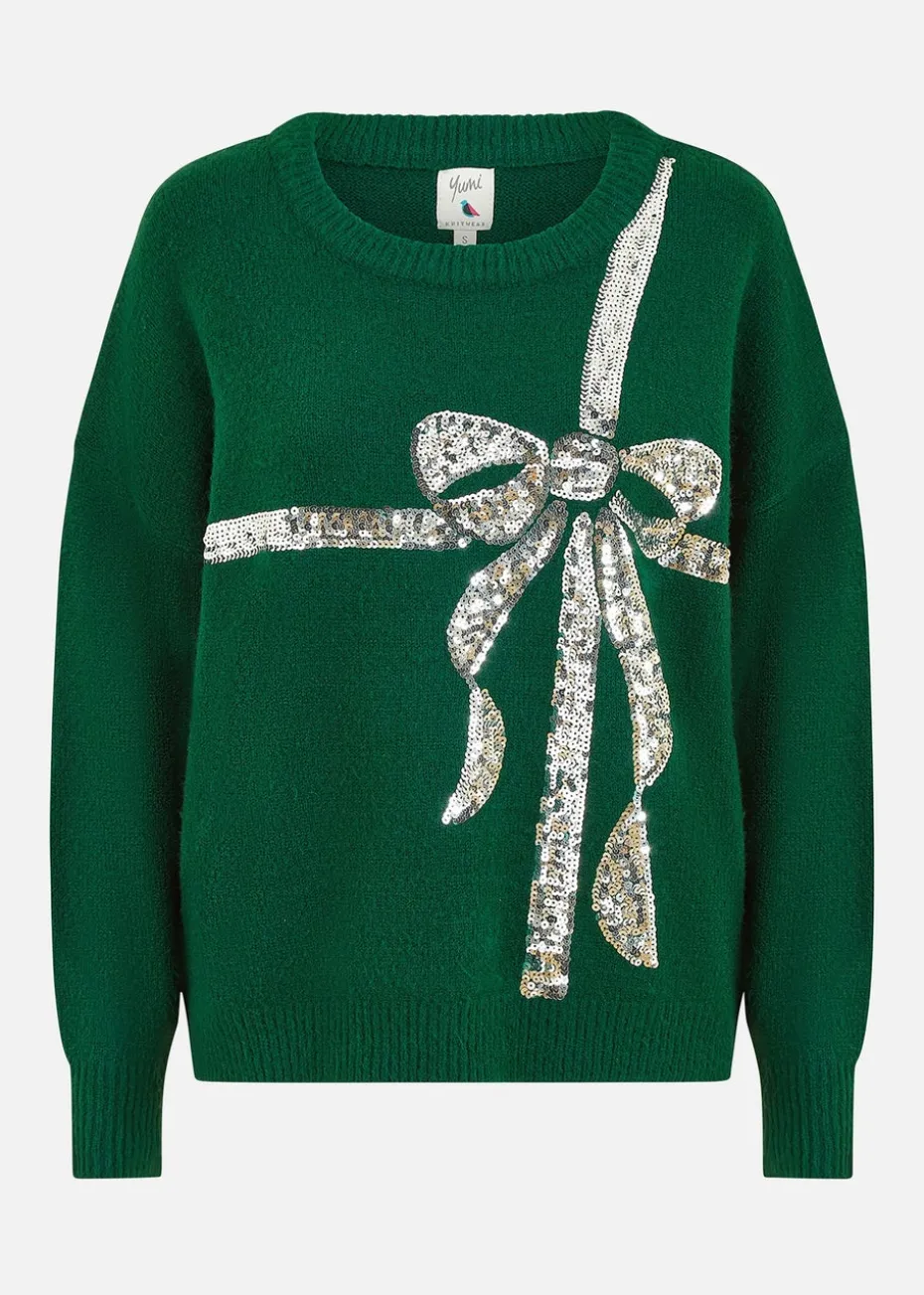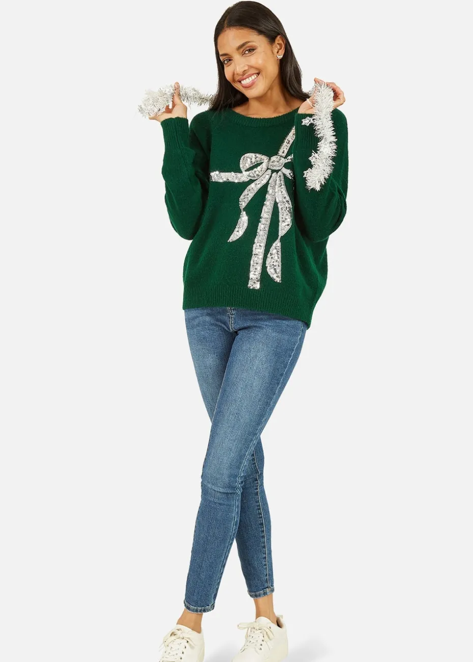 Perfect for layering and easy to match, this fun Green Christmas jumper is covered in a large sequin adorned bow. Knitted and super soft, this piece is perfect for office parties, December activities and festive fun.
