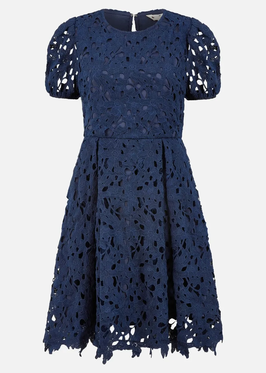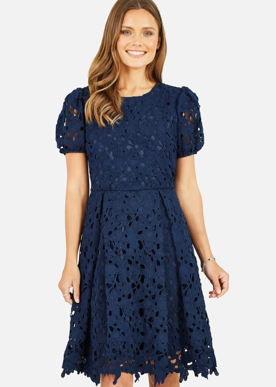 A skater style dress is a class act and we love this lacy version for summer wedding season. The cute puff sleeves add charm and interest, and the fit and flare style of this occasion wear dress is perfectly flattering on everybody. The rich navy colour pairs beautifully with gold accessories for dressing up.