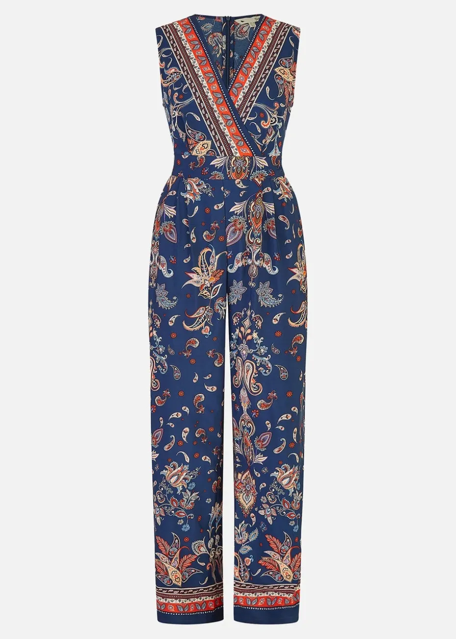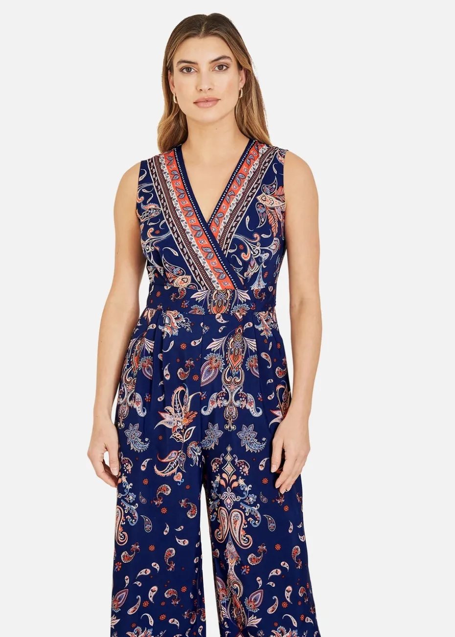 Yumi Navy Paisley Border Print Wrap Jumpsuit