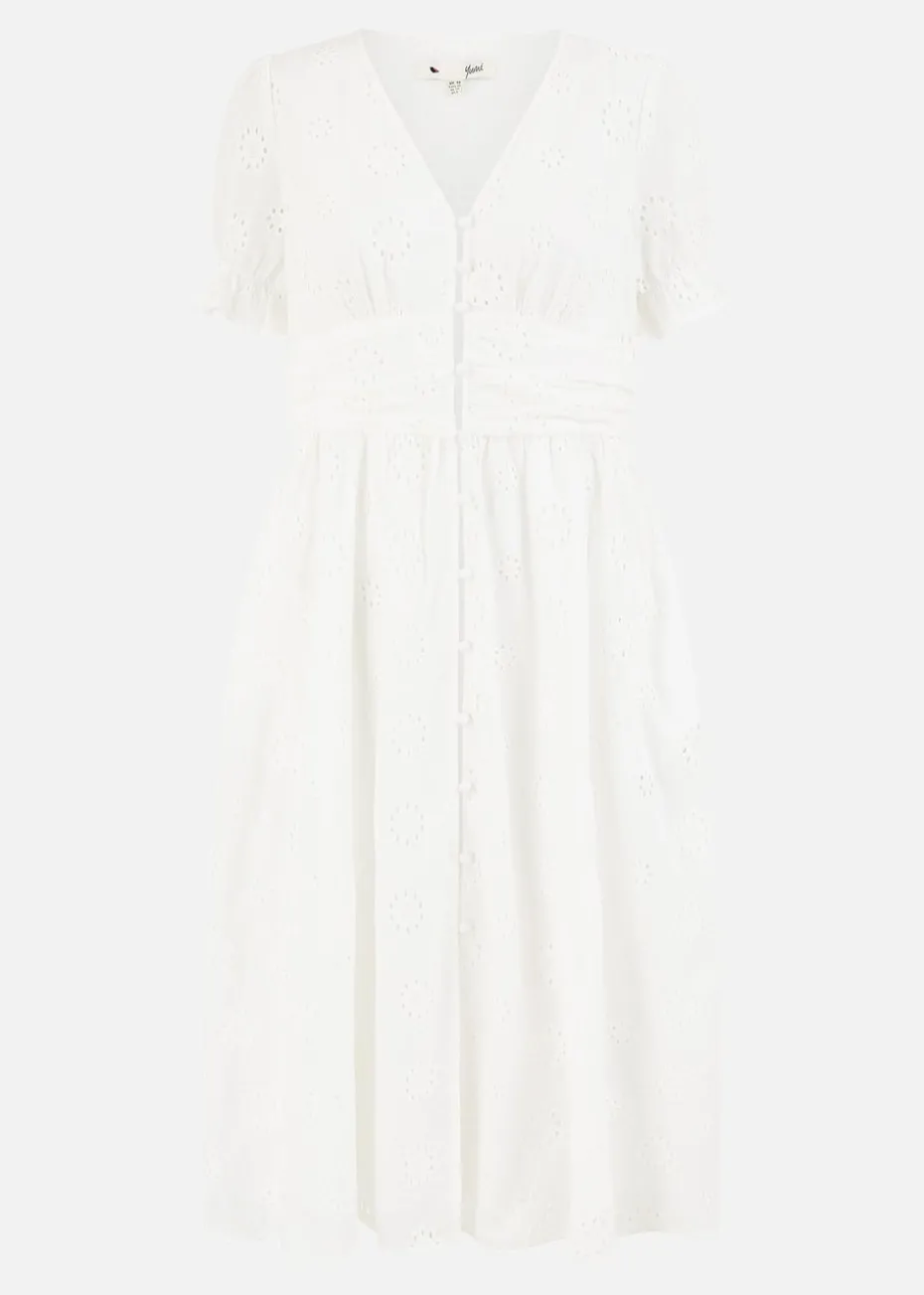 Yumi White Cotton Broderie Anglaise Midi Button Up Dress
