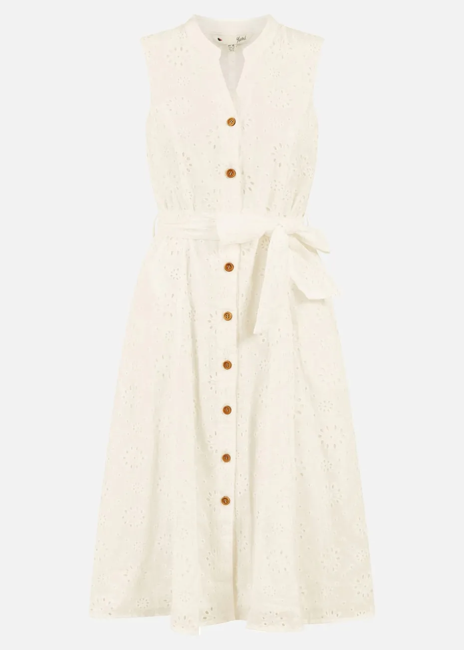 Broderie Anglaise is big news for the summer, and this flower version is super cute! The sleeveless shirt dress design in a midi length looks great with trainers or sandals and a denim jacket. A lightweight cotton mix makes this a sunshine essential. The self tie waist, notch neckline and button up design all add to this charming dress.