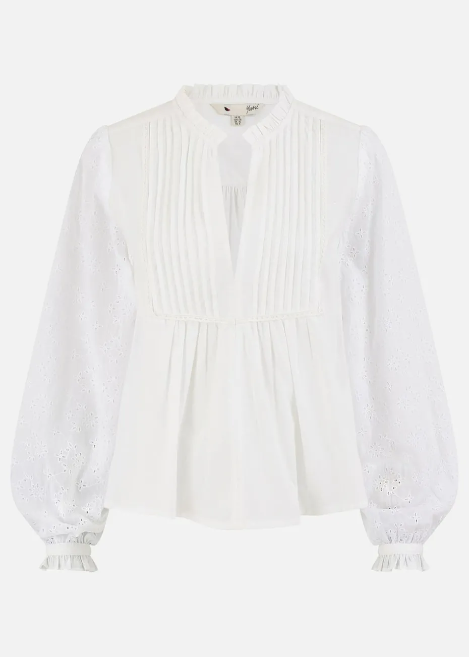 We love this easy and relaxed shirt for the summer. Made from cotton for a cool and chic look, with a bib style front, notch neckline and broderie anglaise sleeves. Pair with denim and trainers for everyday wear.